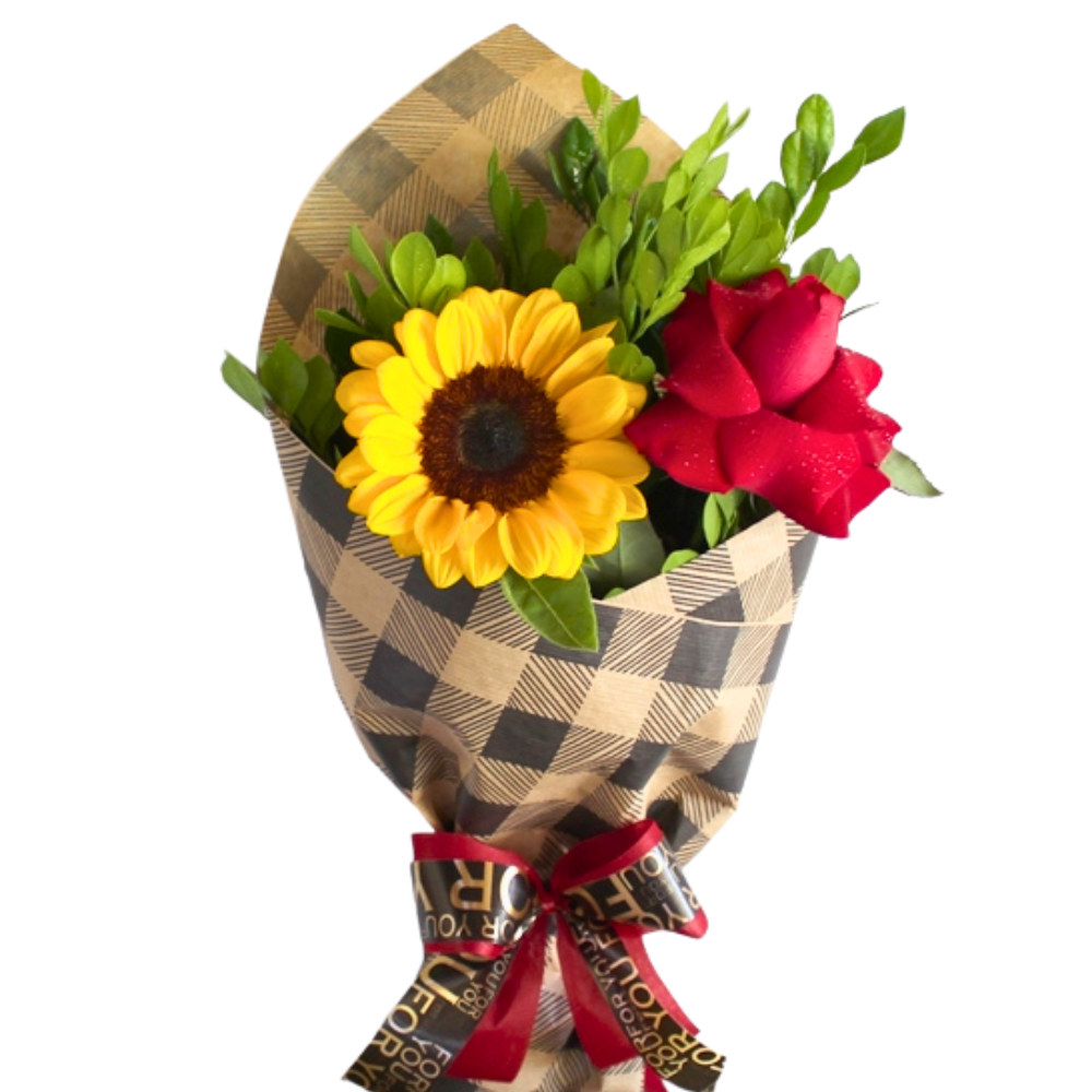 Compartilhe o amor e a alegria da natureza com nosso buquê a dois, apresentando uma rosa vermelha aberta e um vibrante girassol, adornados com folhagem verde, delicadamente embalados em uma folha de papel kraft. O presente ideal para celebrar momentos especiais a dois com beleza e significado