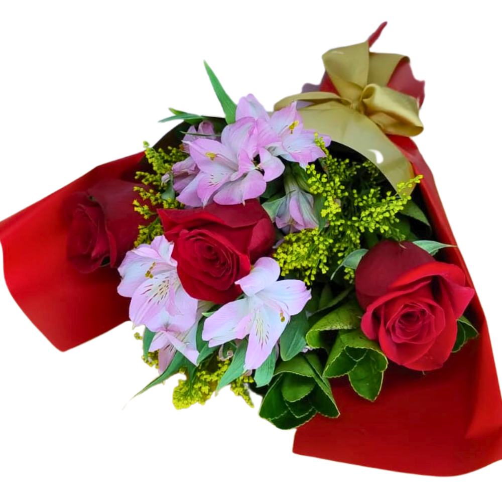 Buquê Clássico de 3 Rosas e Astromélias